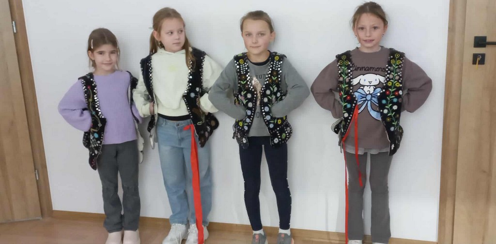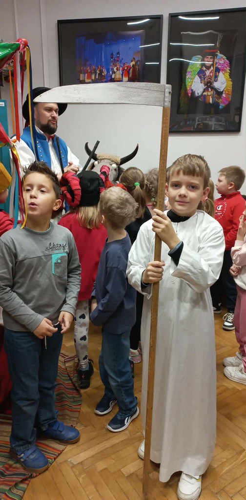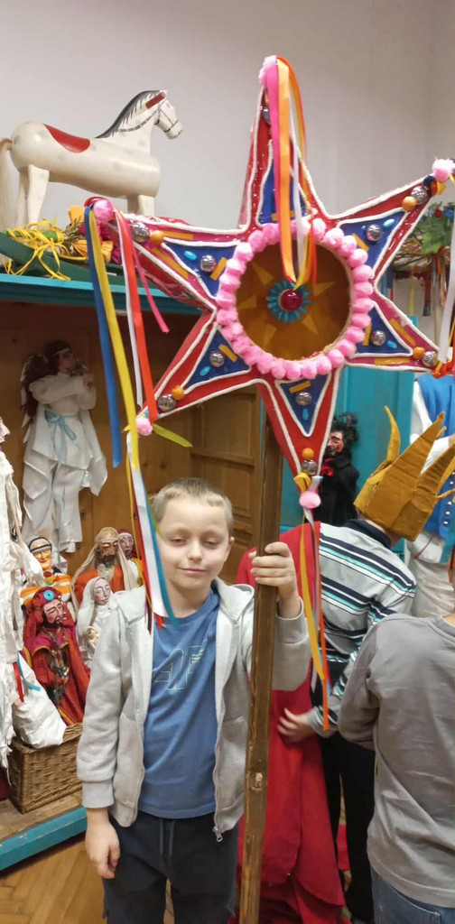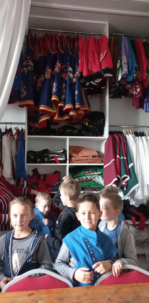 Tradycje Pogórzan związane z obrzędowością, rękodziełem oraz strojami ludowymi dzieci mogły obejrzeć w dwóch salach wystawienniczych. Tu dużym zainteresowaniem cieszyły się instrumenty, ozdoby z papieru oraz szopki. Okazało się, że dawna tradycja kolędowania jest bardzo mało znana, tym większym więc zaciekawieniem cieszyły się przebrania kolędników. Film o zespole przybliżył 60 lat prób, występów, repertuaru oraz nagród i sukcesów. W garderobie każdy mógł obejrzeć i przymierzyć stroje regionalne zarówno pogórzańskie, jak i lubelskie, czy rzeszowskie i dowiedzieć się jak się nazywają. Dziękujemy Gorlickiemu Centrum Kultury za tak ciekawe zajęcia, które przybliżyły dzieciom tradycje i kulturę naszej małej ojczyzny. Zachęcamy do obejrzenia relacji z wizyty dzieci na stronie GCK na Facebooku.