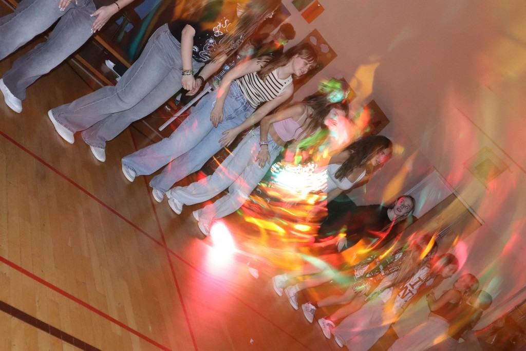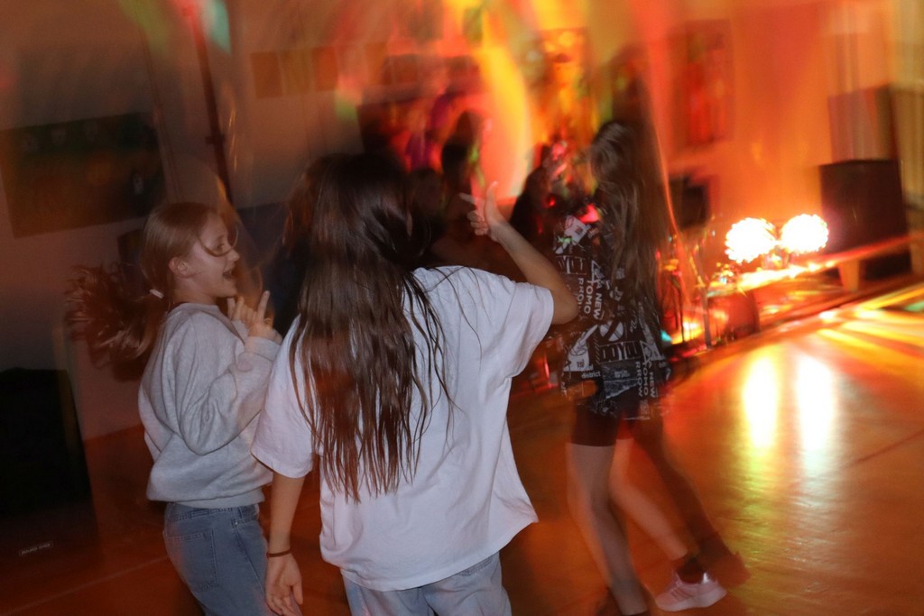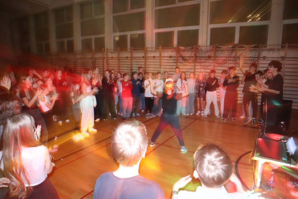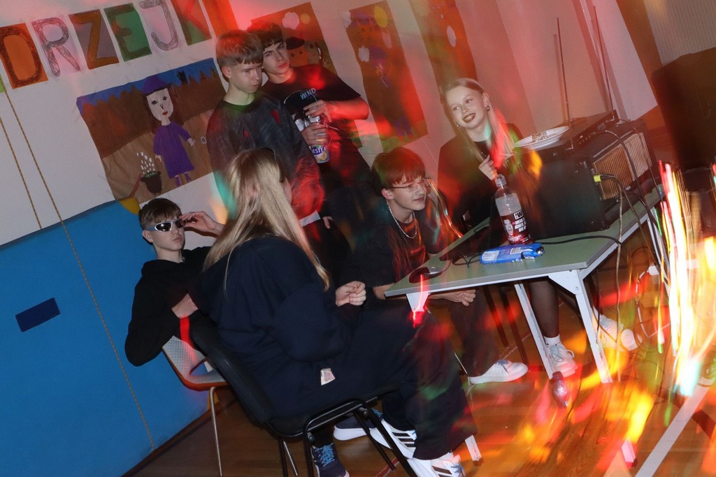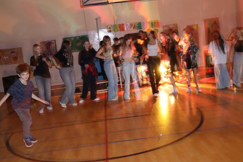 Dzięki energicznym rytmom i ulubionym hitom naszych uczniów parkiet szybko zapełnił się tancerzami. Młodzież bawiła się doskonale, a wspólna zabawa sprzyjała integracji i budowaniu pozytywnej atmosfery wśród klas starszych.