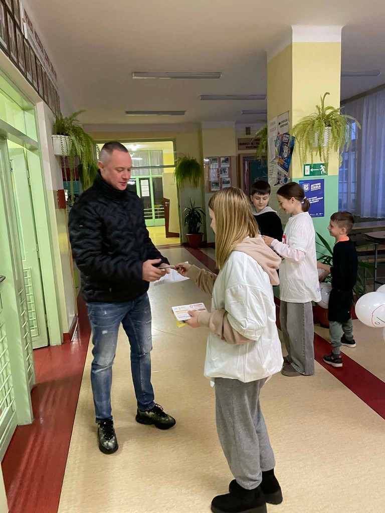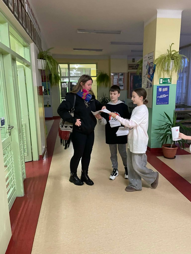 Uczniowie rozdawali również ulotki informacyjne rodzicom przybyłym na zebranie. Wśród materiałów znalazła się także autorska ulotka przygotowana przez Aleksandrę Ryczek z klasy 7a. Jej praca wyróżniała się kreatywnością, dbałością o szczegóły i przede wszystkim mocnym, poruszającym przekazem, który doskonale wpisał się w cele kampanii.