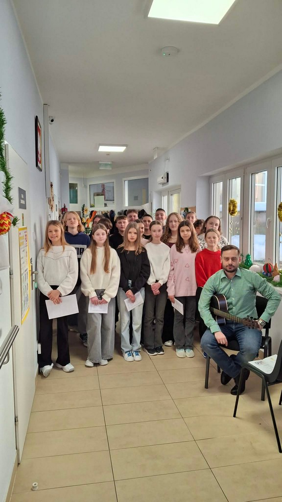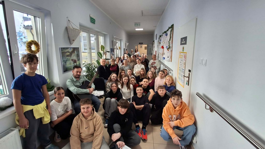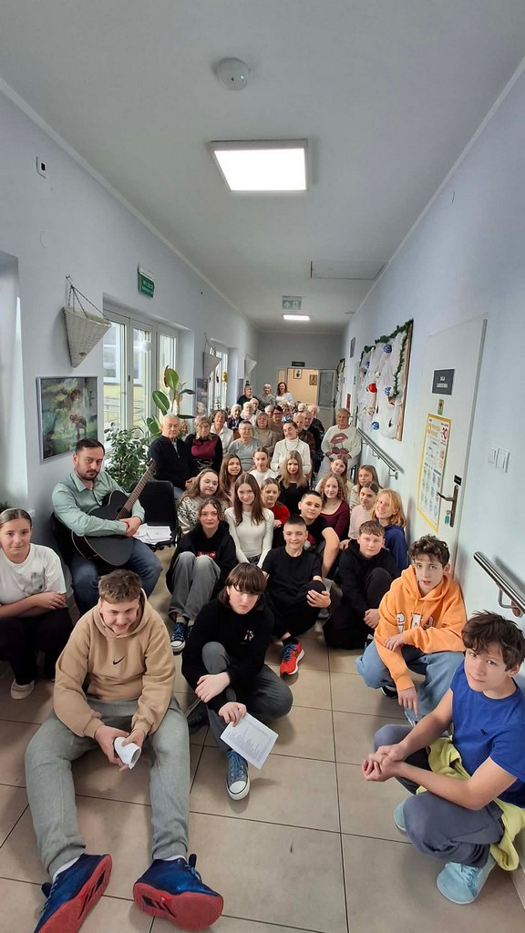 Dnia 16 stycznia uczennice i uczniowie klasy 6a pod opieką pana Piotra Przyrowskiego udali się do Dziennego Domu Seniora w Gorlicach na spotkanie integrujące pokolenia. Jak zawsze przyjęto nas z uśmiechem, życzliwością i radością. Wspólne śpiewanie na wszystkie głosy żeńskie i męskie, wysokie i niskie, dziecięce i dojrzałe rozbrzmiewało w gościnnej sali Dziennego Domu Seniora. Przy akompaniamencie gitary z wielu ust popłynęły najbardziej znane polskie kolędy i pastorałki. Radość spotkania wytworzoną naturalnie podczas integrującego muzykowania podkreślił także słodki poczęstunek, jakim uczniowie zostali obdarowani przez seniorów na koniec. Dziękujemy za ten piękny, wspólny czas.