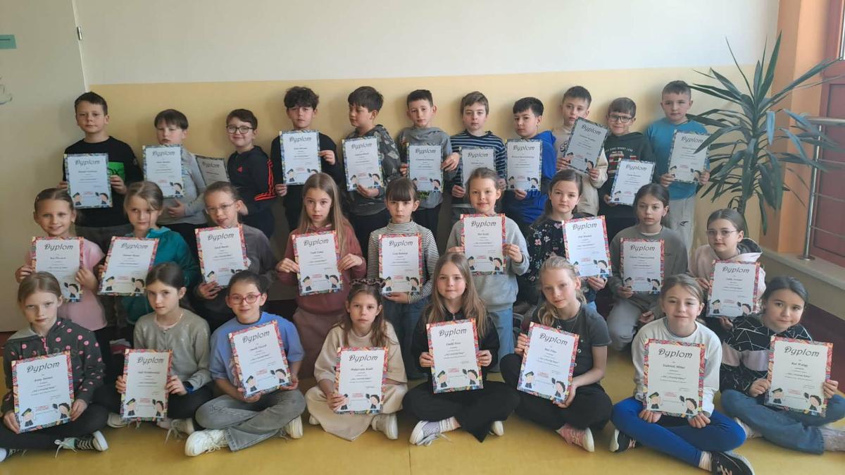 W ostatnich dniach w klasach młodszych rozdano dyplomy w konkursach wiedzy ogólnej za pierwsze półrocze roku szkolnego 2025/2026, na każdym poziomie.