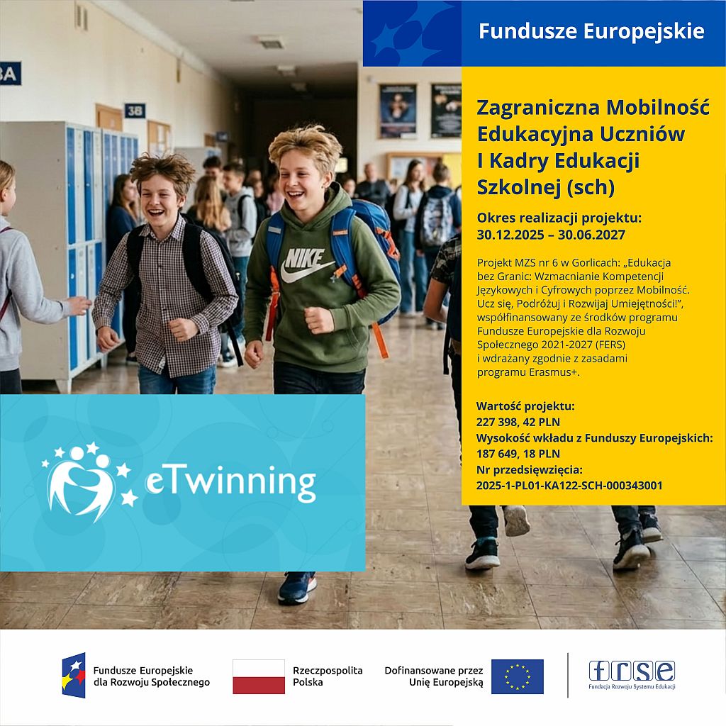 Projekt: „Edukacja bez Granic: Wzmacnianie Kompetencji Językowych i Cyfrowych poprzez Mobilność. Ucz się, Podróżuj i Rozwijaj Umiejętności!”, jest współfinansowany ze środków programu Fundusze Europejskie dla Rozwoju Społecznego 2021-2027 (FERS) i wdrażany zgodnie z zasadami programu Erasmus+.