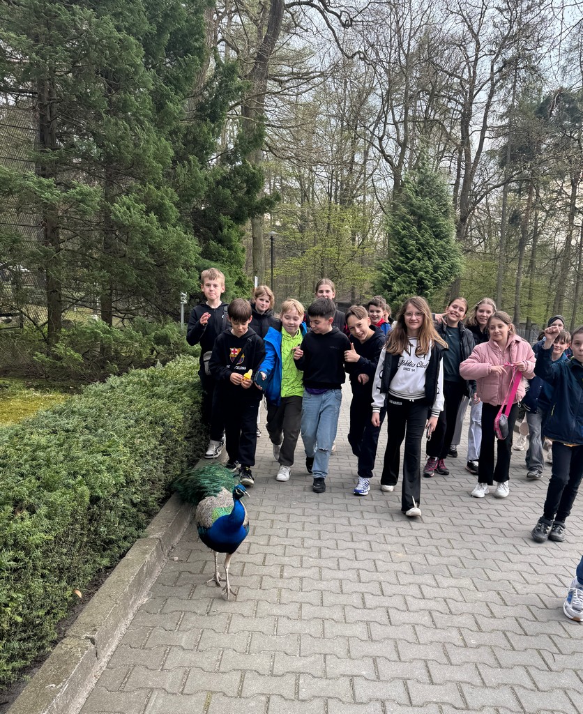 Prawdziwą niespodzianką okazał się jednak paw, który postanowił zostać nieformalnym przewodnikiem grupy. Dumnie kroczył alejkami tuż obok uczniów, jakby pilnował, by nikt się nie zgubił.