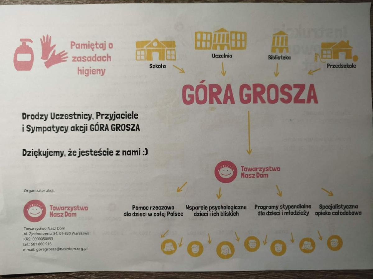 SU naszej szkoły w kalendarz wydarzeń od kilku lat ma wpisany udział w akcji GÓRA GROSZA. Celem akcji, jak czytamy na stronie Towarzystwa Nasz Dom jest zebranie funduszy na pomoc psychologiczną, rzeczową i specjalistyczną dla dzieci (w szczególności wychowujących się poza własnym środowiskiem rodzinnym) i rodzin.